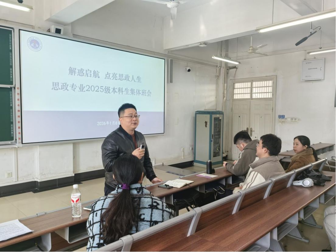 (通讯员:李胜蓝 何晓龙)1月8日上午10时,bbin连环夺宝官网思想政治教育系在北区教学综合楼202室举行2025级新生集体班会。本次班会以“解惑启航 点亮思政人生”为主题,旨在引导新生深化专业认知、锚定发展方向。学院副院长陈军、思政领航党支书记曹阳、系主任李胜蓝、副主任何晓龙、2025级班主任及全体本科学生参会。会议由何晓龙主持。