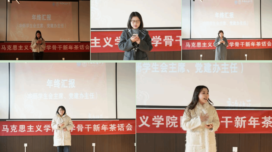 活动在温馨的新年祝福视频中拉开序幕,视频由党建办与研会分别完成制作,全体部员出镜表达新年祝愿。随后,研会代表闵梦萍、刘俊奇、蒋秋香与党建办代表余文豪、弋馨雅依次进行年度工作汇报与新年寄语,结合工作实际分享成长体会,展现学生骨干的责任担当。