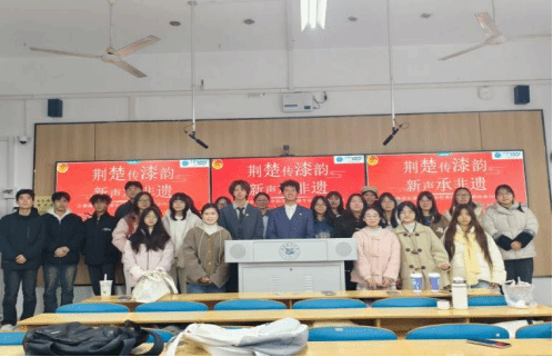 魏俊辉与徐文祥以“荆楚传漆韵,新声承非遗”为题开展理论宣讲,首先以湖北省博物馆“光彩于文——中国漆器艺术特展”中的精美漆器照片为引,带领同学们步入流光溢彩的漆艺世界,一同感受穿越千年的审美意境与古代工匠的非凡智慧。