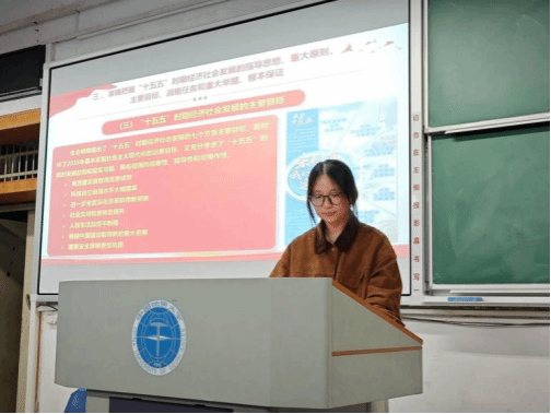 其次,蒋雅琴同学围绕“准确把握‘十五五’时期经济社会发展的指导思想、重大原则、主要目标”展开讲解,系统阐述了“十五五”时期发展的指导思想、必须遵循的“六个坚持”原则以及七个方面主要目标,引导同学们深刻理解国家发展的战略导向和总体布局,帮助同学们构建起对“十五五”发展蓝图的整体认知。